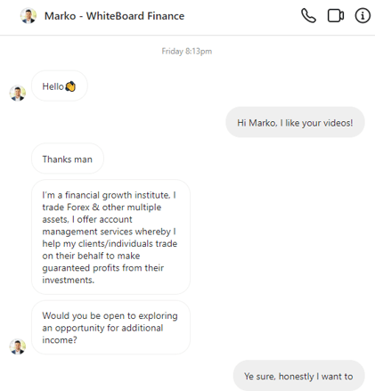 The scammer impersonated US-based influencer Marko Zlatic, who goes by “WhiteBoard Finance.”