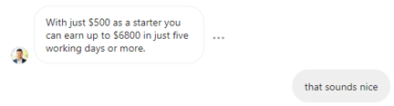 After initial messages and offering us access to their investment platform where we can “earn up to $6800 in just five working days” with just a 500$ first payment, we decided to go for it.
