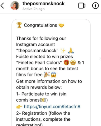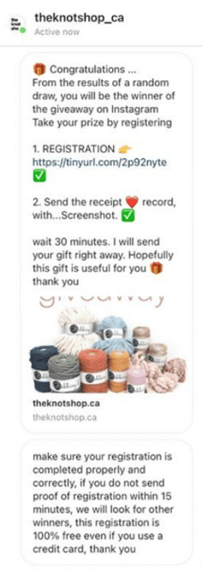 An attacker sets up a fake profile of the targeted company or brand by slightly changing its name. For example, “theposmanknocks” vs. “thepostmanknocks.” According to our research, the scammers are monitoring followers of the original Instagram account, and a while after a victim starts following them, he or she will receive a message from a fake account saying that they were selected to win free products.