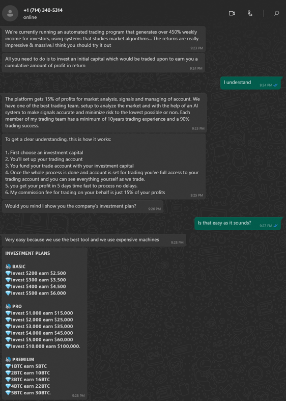 On WhatsApp, he offered us a “too good to be true” investment plan. We could invest up to $10,000 and earn $100,000 for just a 15% commission fee. To process this further, he instructed us to buy bitcoins.